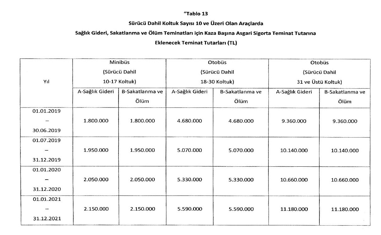 Araçların 01 Ocak 2025 Teminat Limit Tabloları
